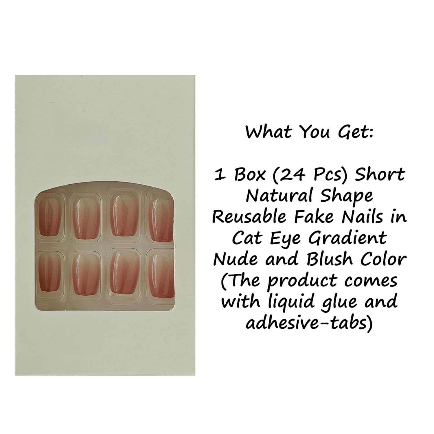 S.A.V.I 24 Pcs Reusable Cat Eye Nude & Blush Gradient Fake Nails | Short Square Press On Nails Kit with Glue & Adhesive Tabs | Glossy Finish DIY Nail Art for Women & Girls