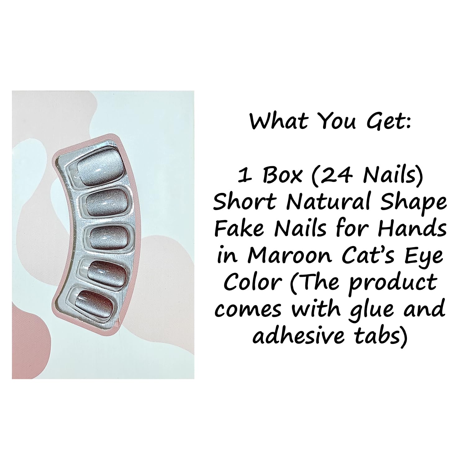 S.A.V.I 24 Pcs Short Natural Shape Fake Nails for Women – Maroon Cat’s Eye Glossy Finish