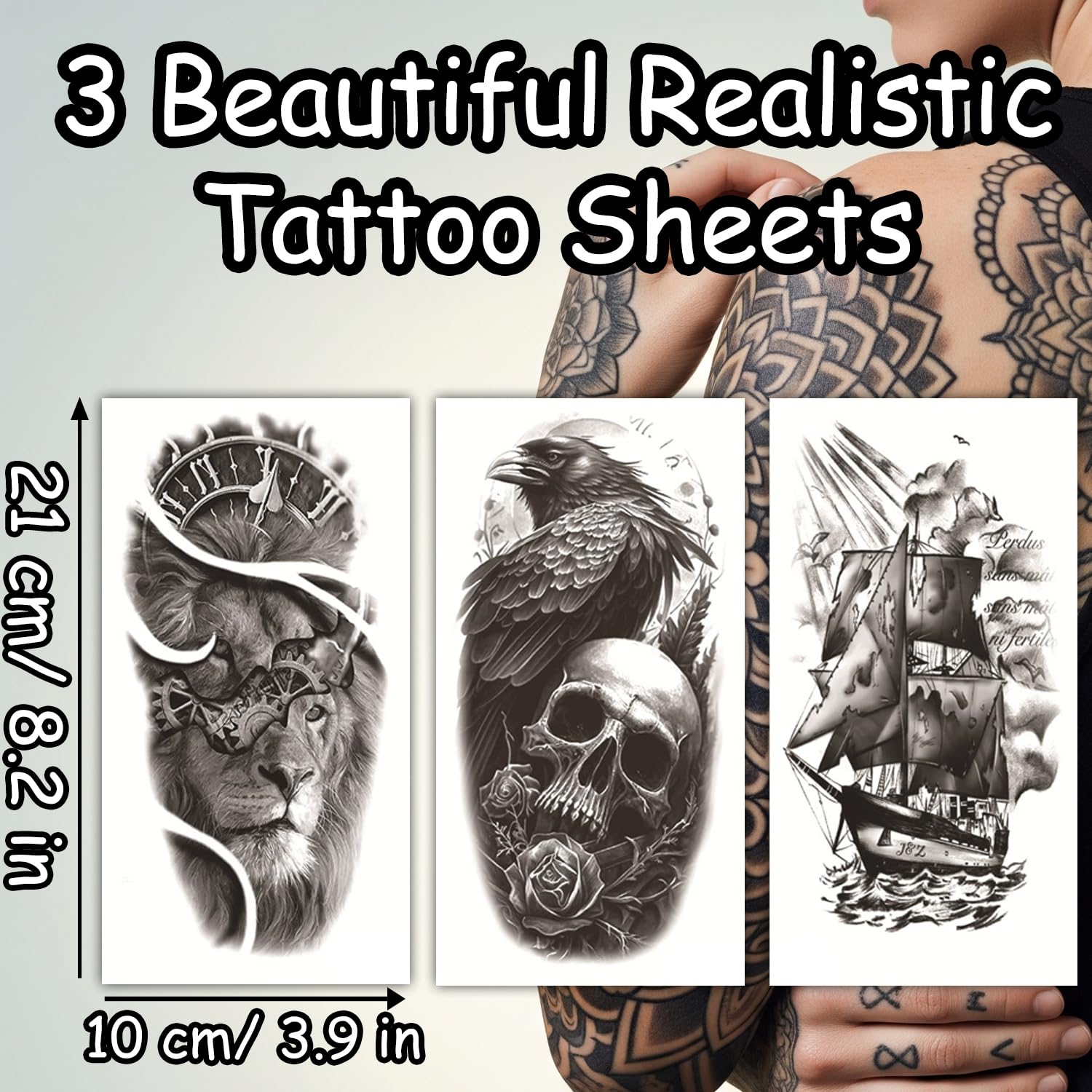 S.A.V.I 3 Large Realistic Temporary Tattoo Sheets for Men & Women – Waterproof, Non-Toxic Body Art Stickers – Lion, Ship, Skull with Raven – 21x10 cm Long Lasting Arm & Back Tattoos