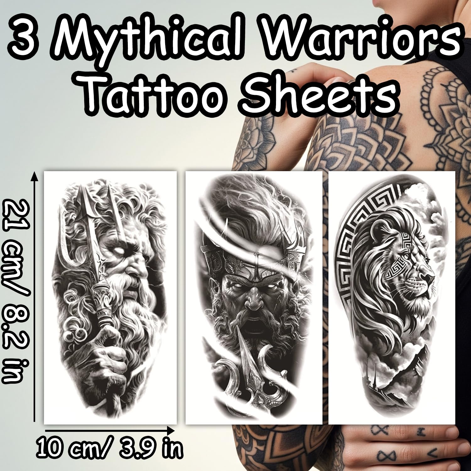 S.A.V.I 3 PCS Large Temporary Tattoo Stickers for Men – Mythical Warrior & Lion Design, Black Waterproof Body Art, 21x10 cm, Safe Non-Toxic, Long-Lasting Arm & Shoulder Tattoos