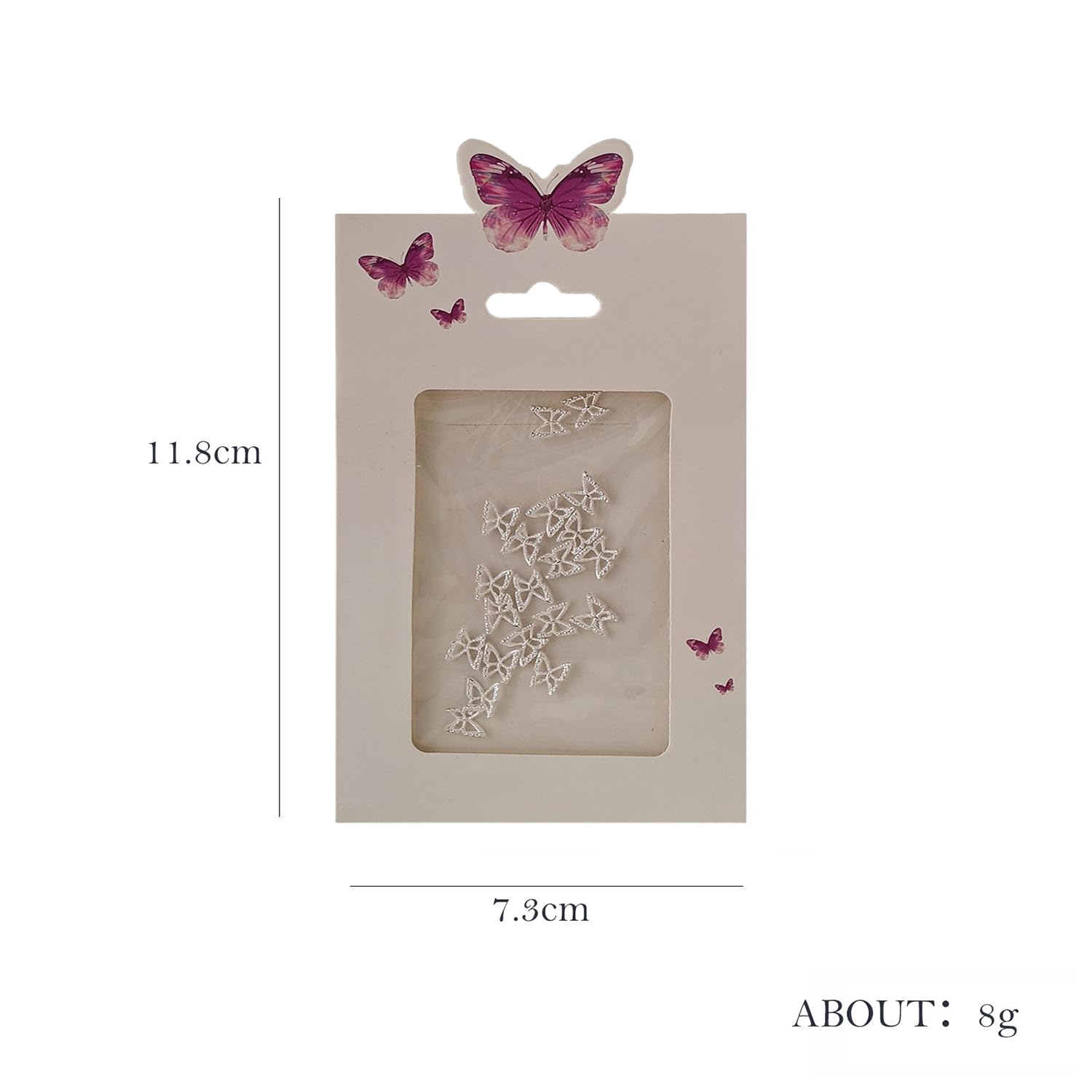 This 20-piece set gives you ample designs to play with, allowing you to experiment with a variety of nail art styles – from everyday elegance to bold party looks. Whether you're getting ready for a wedding, festival, or casual day out, these silver butterfly charms are the perfect accessory to complement your style.