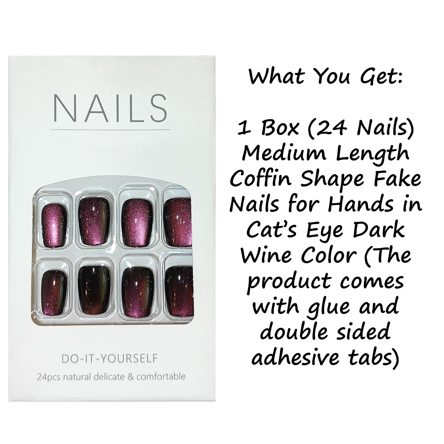 Each set includes 24 medium length coffin-shaped nails with a stunning cat’s eye magnetic effect that shifts beautifully under light, making your hands stand out at every occasion. Whether you’re attending a wedding, party, or just want elegant everyday nails, these press on nails are the perfect choice.