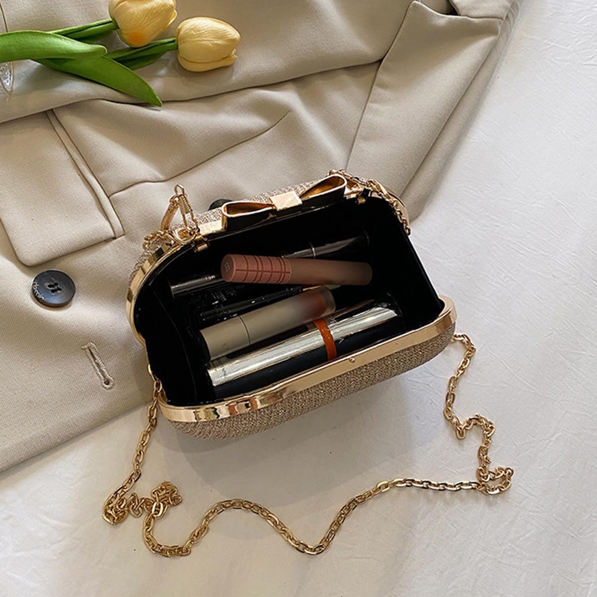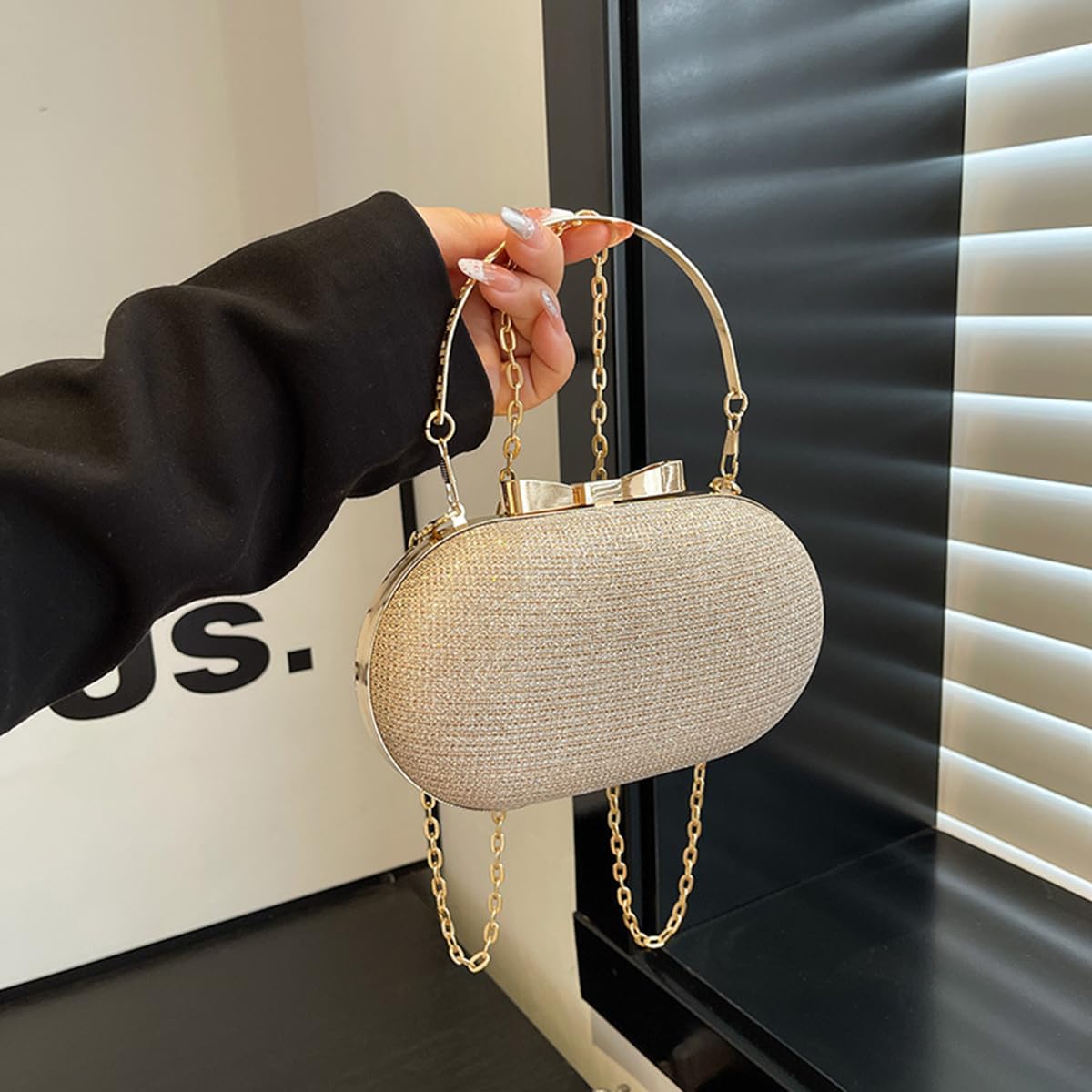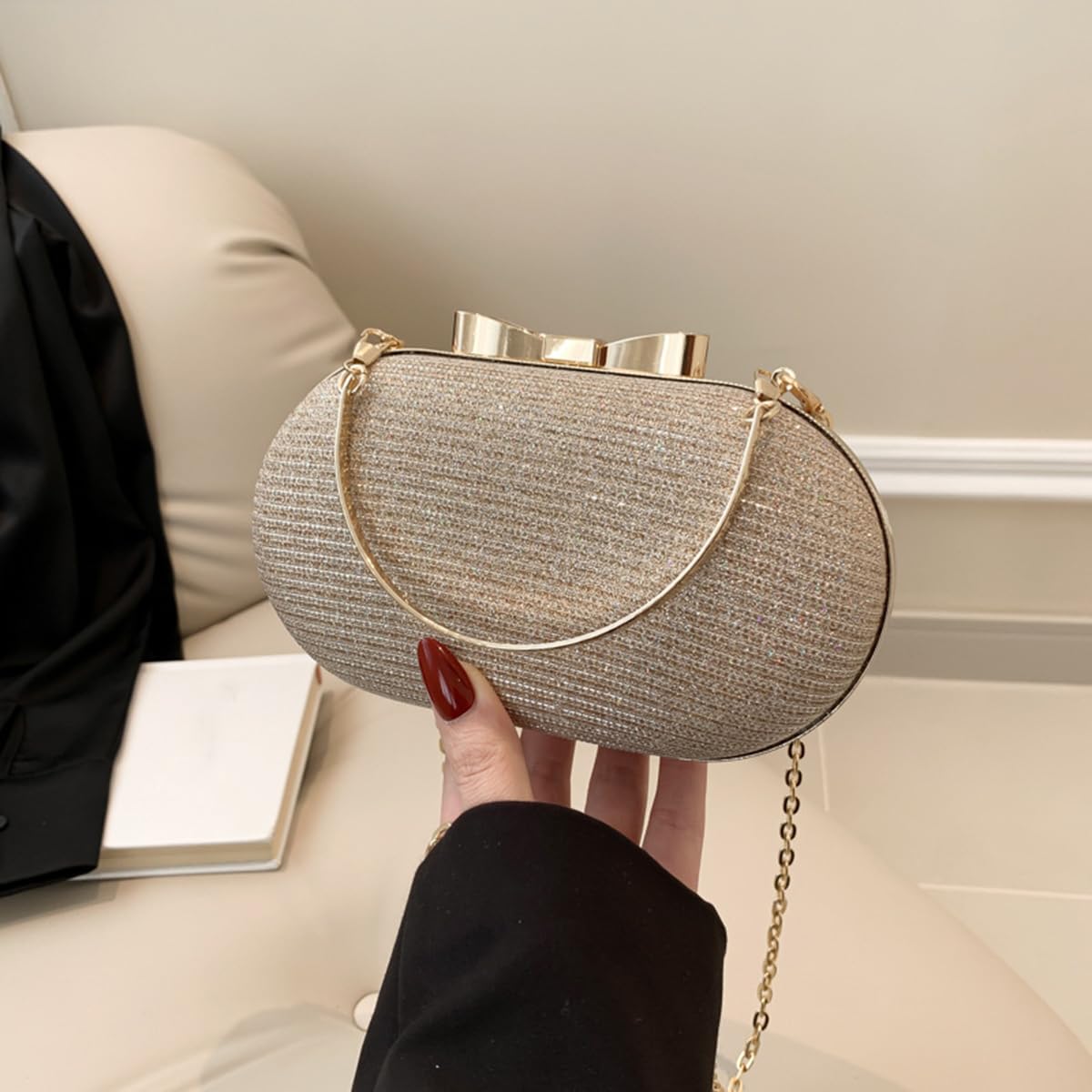S.A.V.I Women’s Gold Glitter Clutch Bag – Oval Hard Case Evening Purse with Chain & Bow Design, Party & Wedding Handbag (Gold)